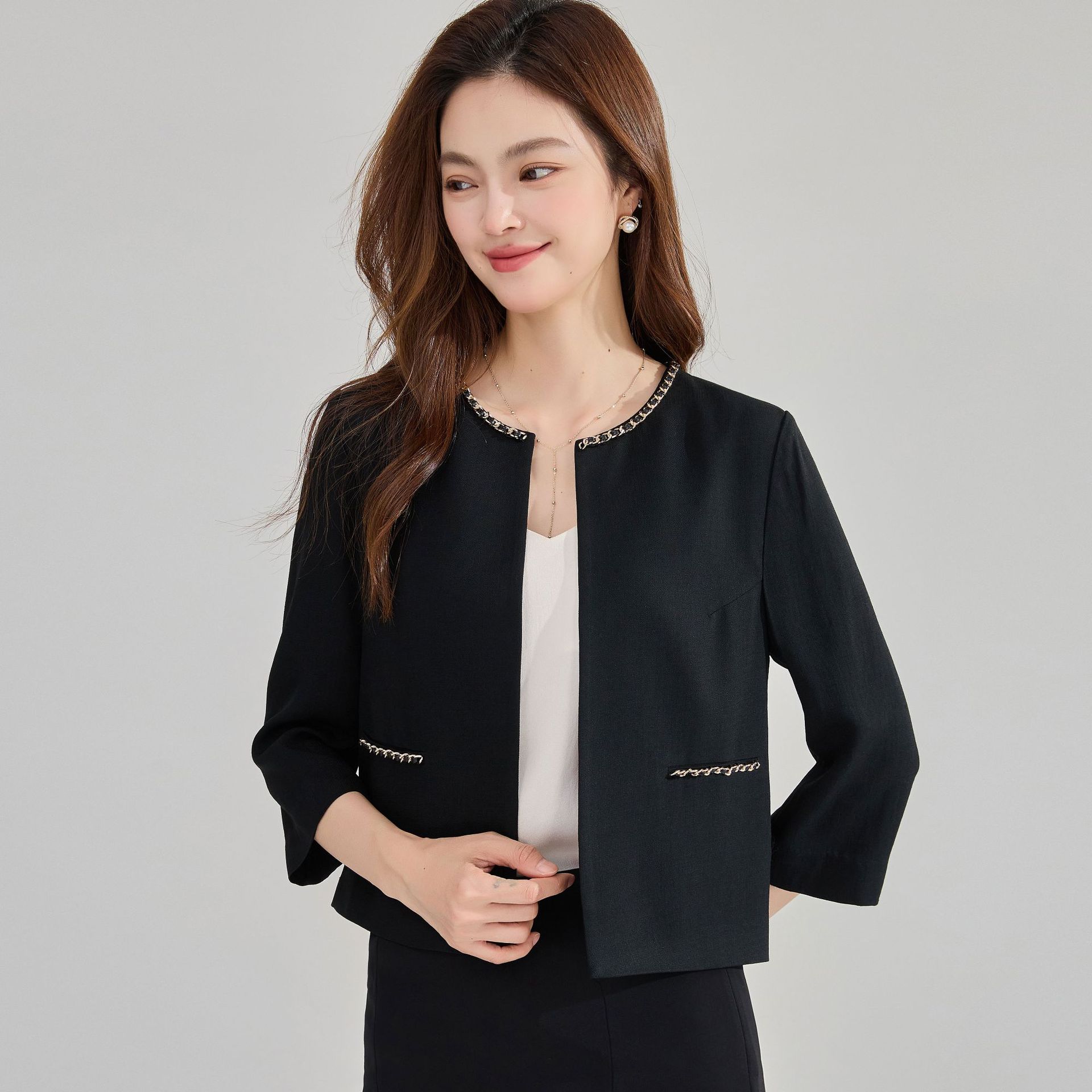 25秋 フレンチ通勤 シンプル 小香風 手縫いメタルチェーン 七分袖 黒 スーツジャケット レディース 15798