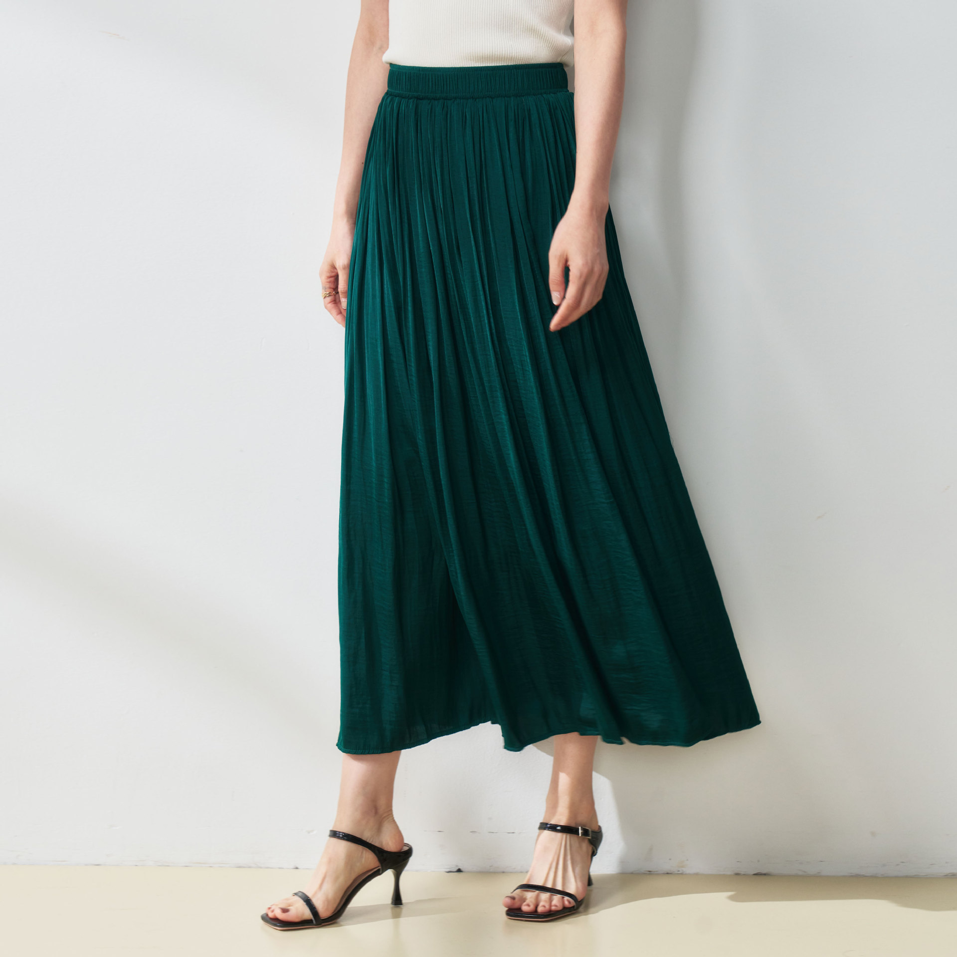 25秋ストリーマースカート 流れるパール光沢シルクサテンプリーツ大裾エアリーAラインスカート 25131