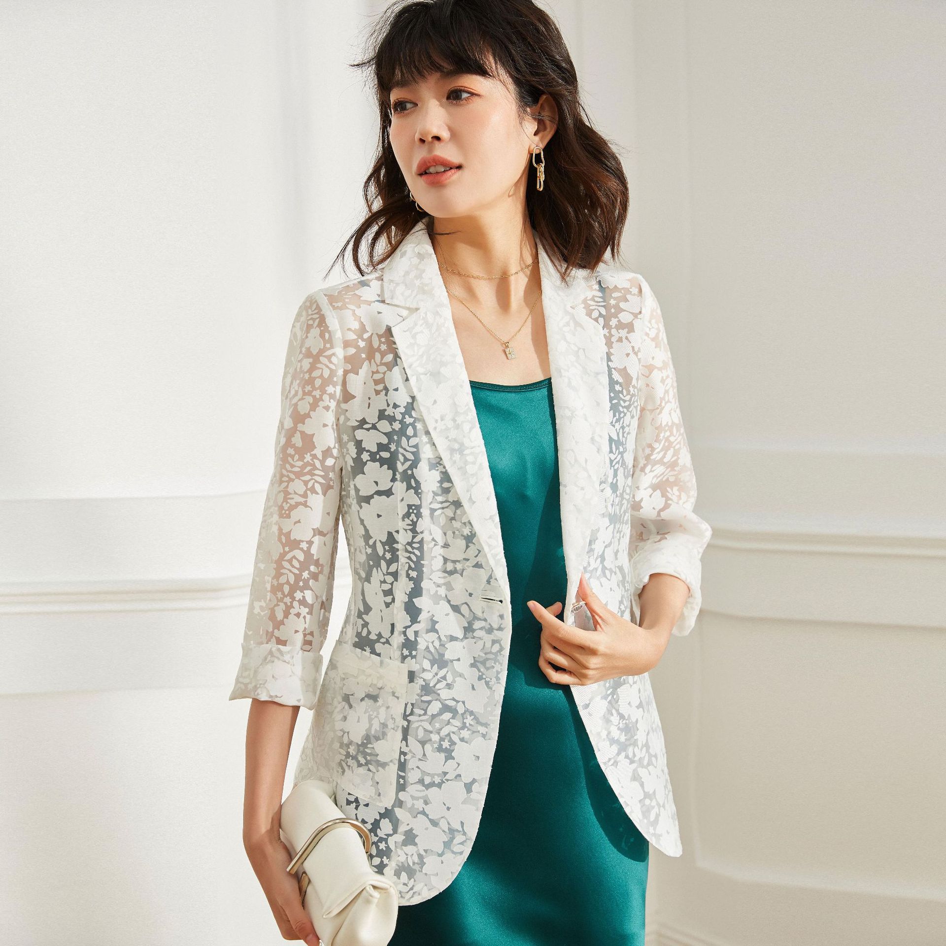 クリアランス盛宏春ジャカード中空薄型シースルースリムレーヨン肌に優しいワンボタン抗スナッチジャケットスーツ女性のための 13376