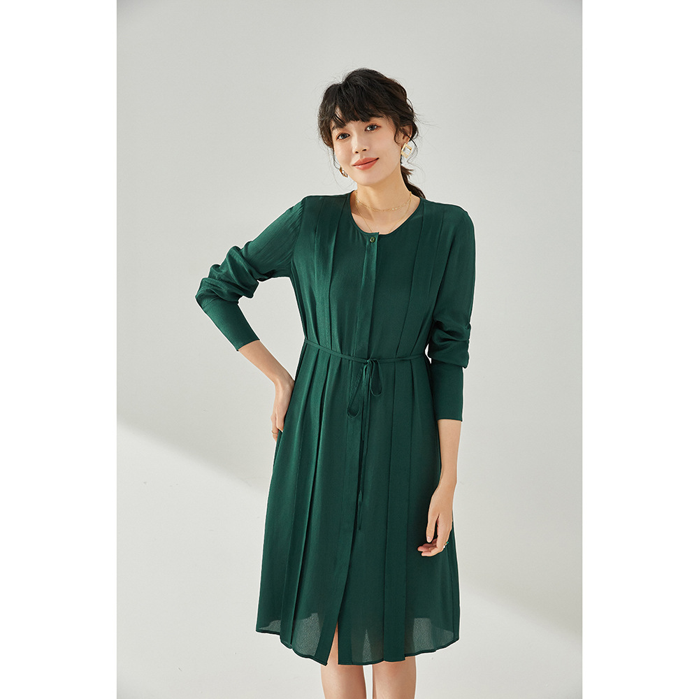 Shenghong 春と夏の新しいラウンドネックファッションルーズレースアッププリーツエレガントなレーヨンミッドレングスドレス女性のための 12850