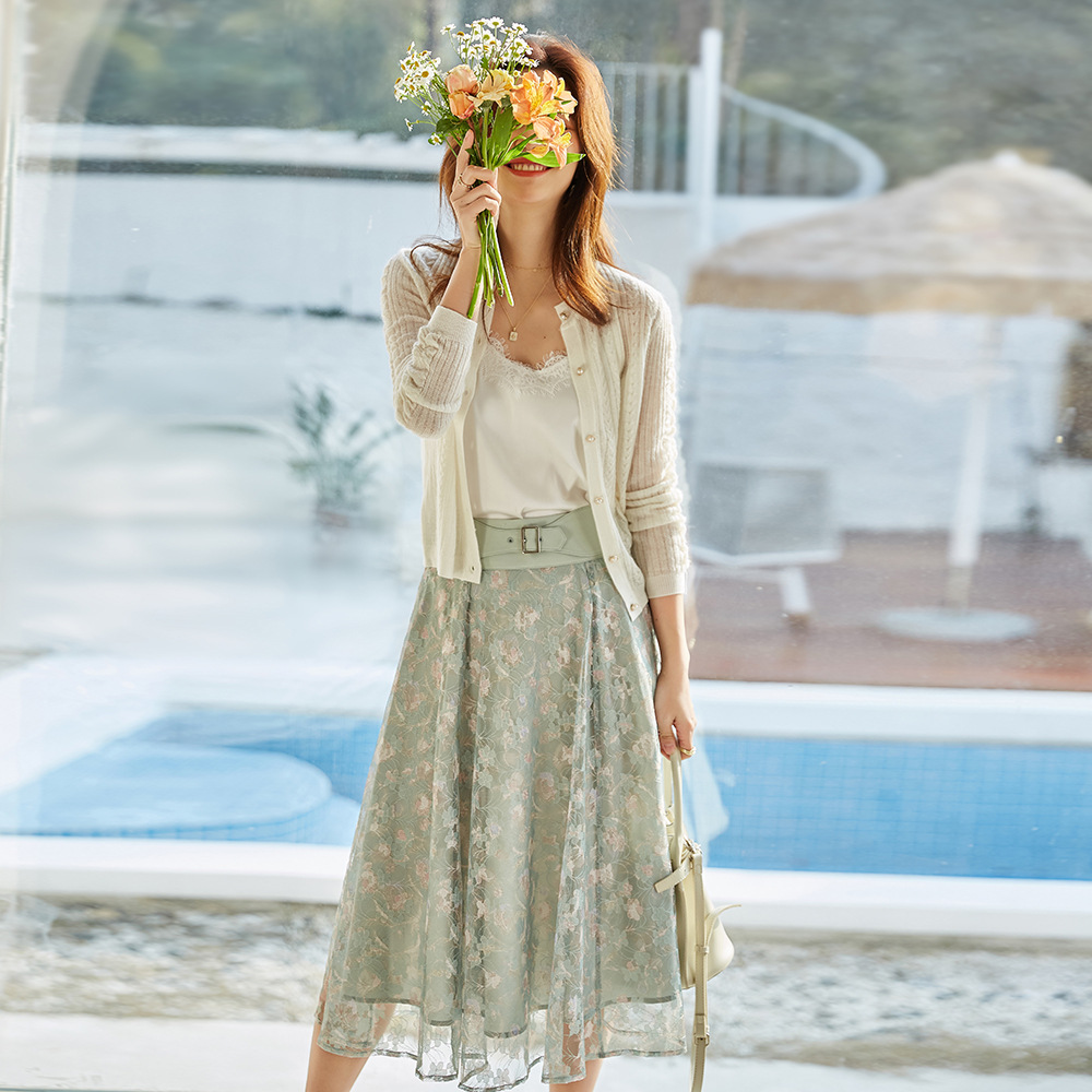 春夏新作レトロレーススプライシングレディライクハイウエスト妖精メッシュミモレ丈スカート 12562