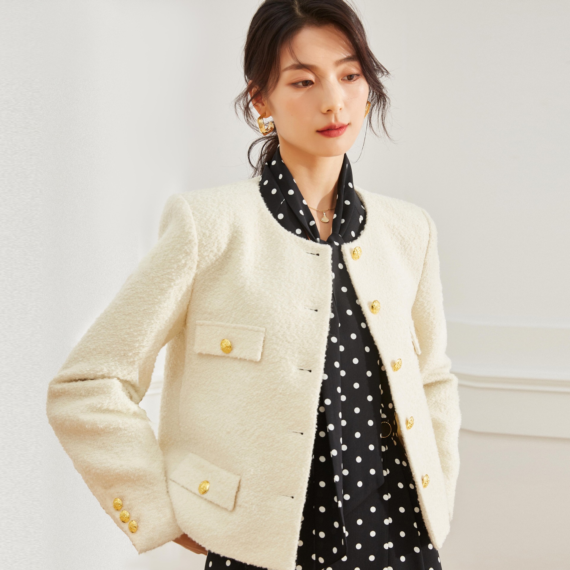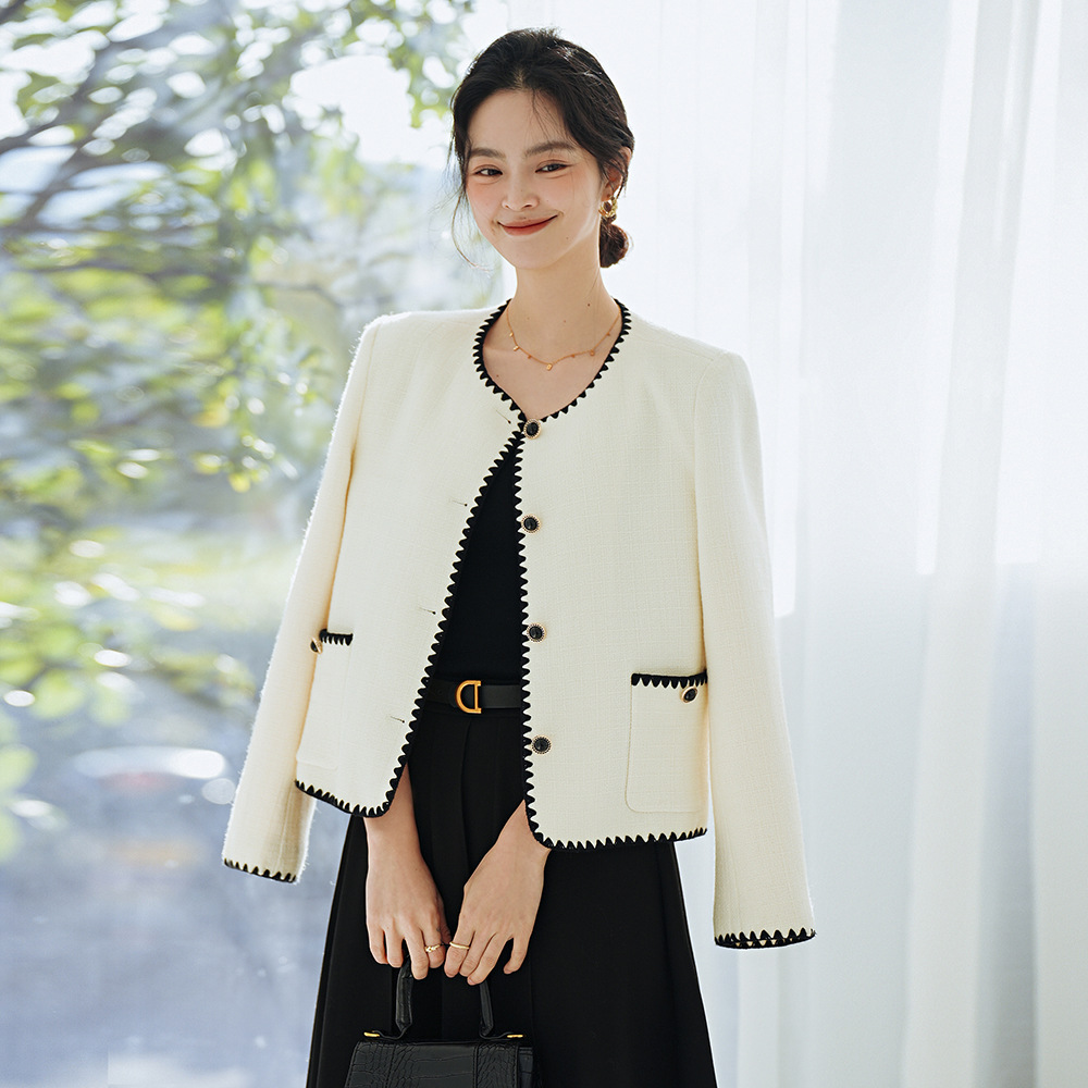 クリアランス Xiaoxiangfeng ジャケット レディース 25 クラシック刺繍ヘップバーンスタイル黒と白のコントラストスタイルウールショートトップ 15184