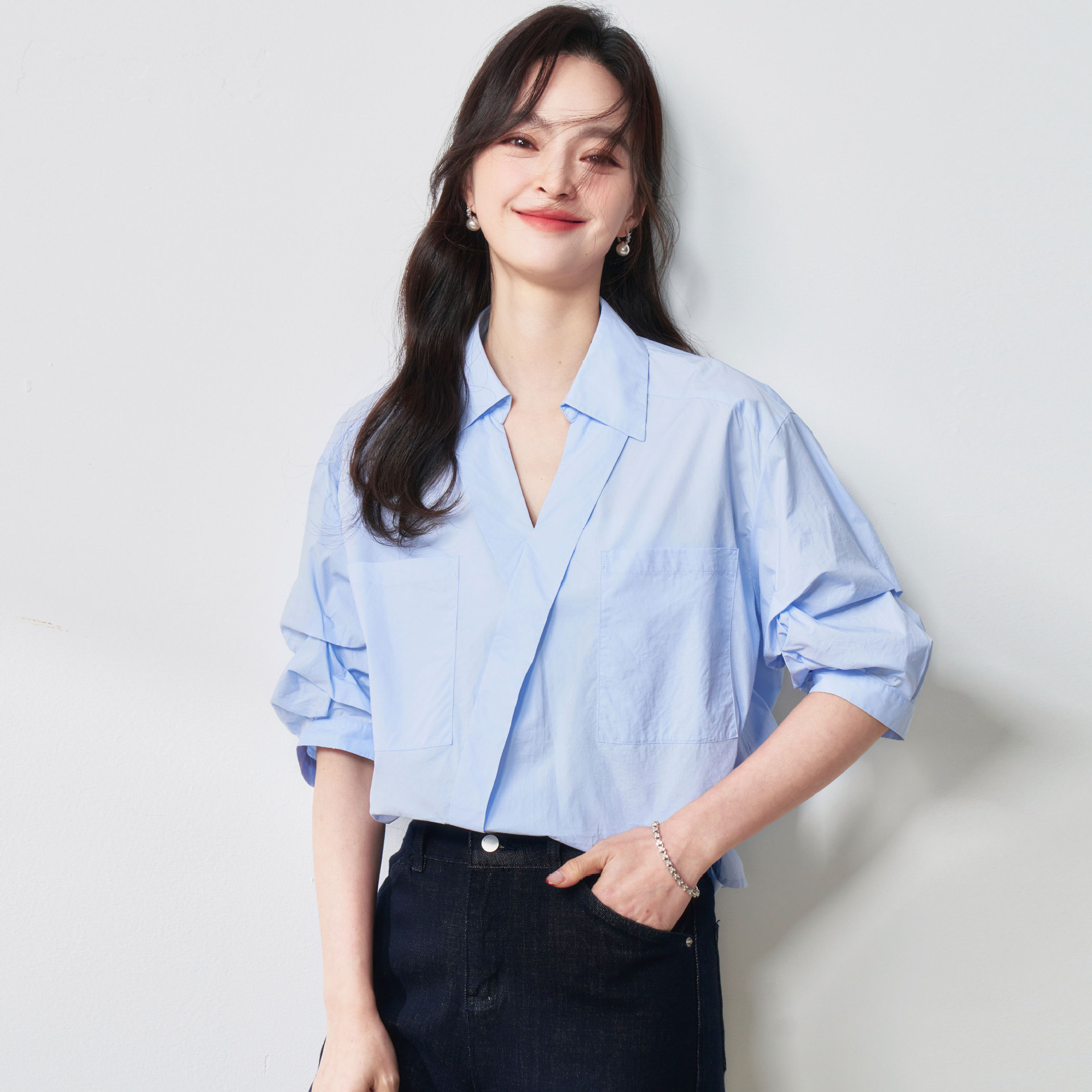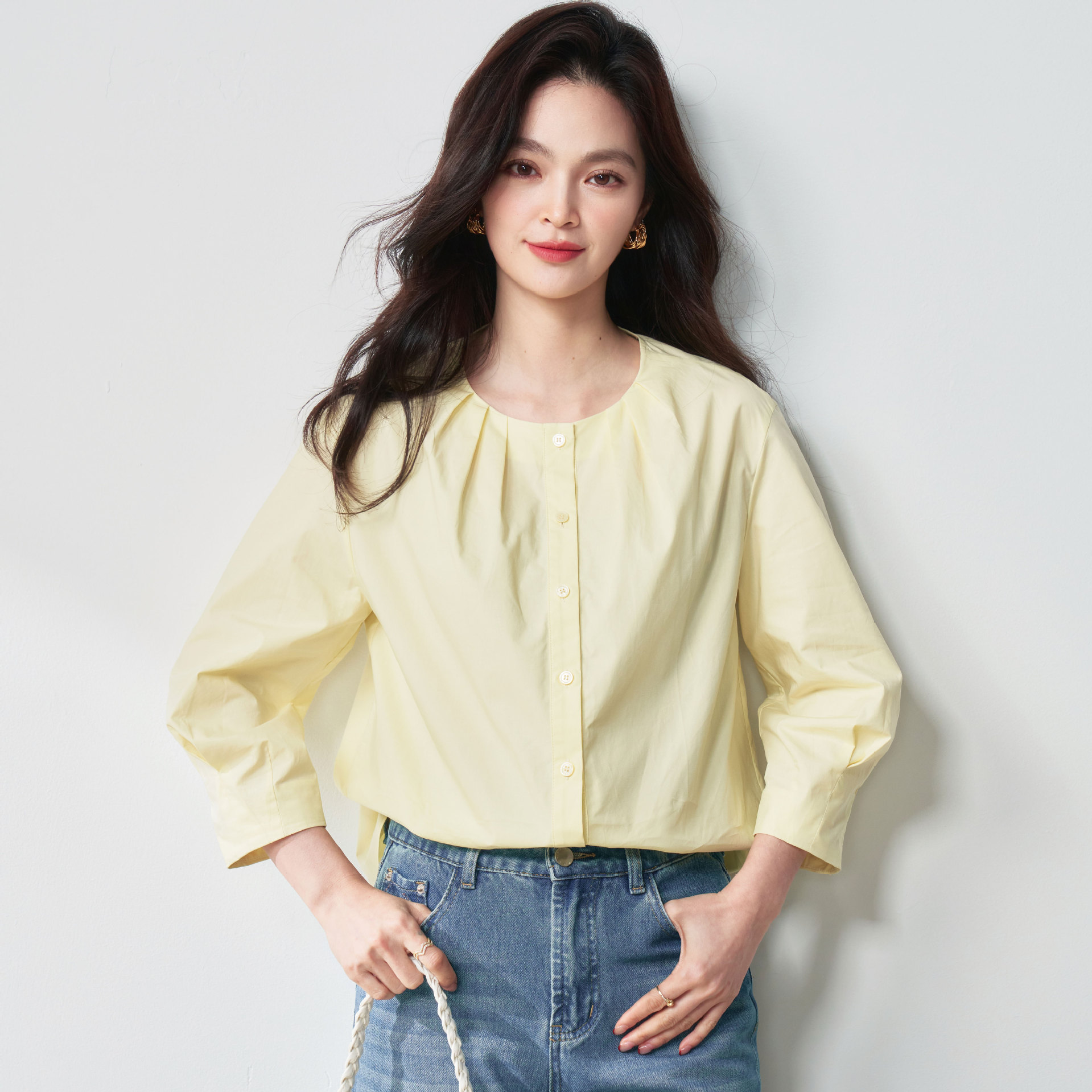 25秋フレンチランタンスリーブシャツ純綿七分袖ルーズラウンドネックシンプル通勤万能トップス25078