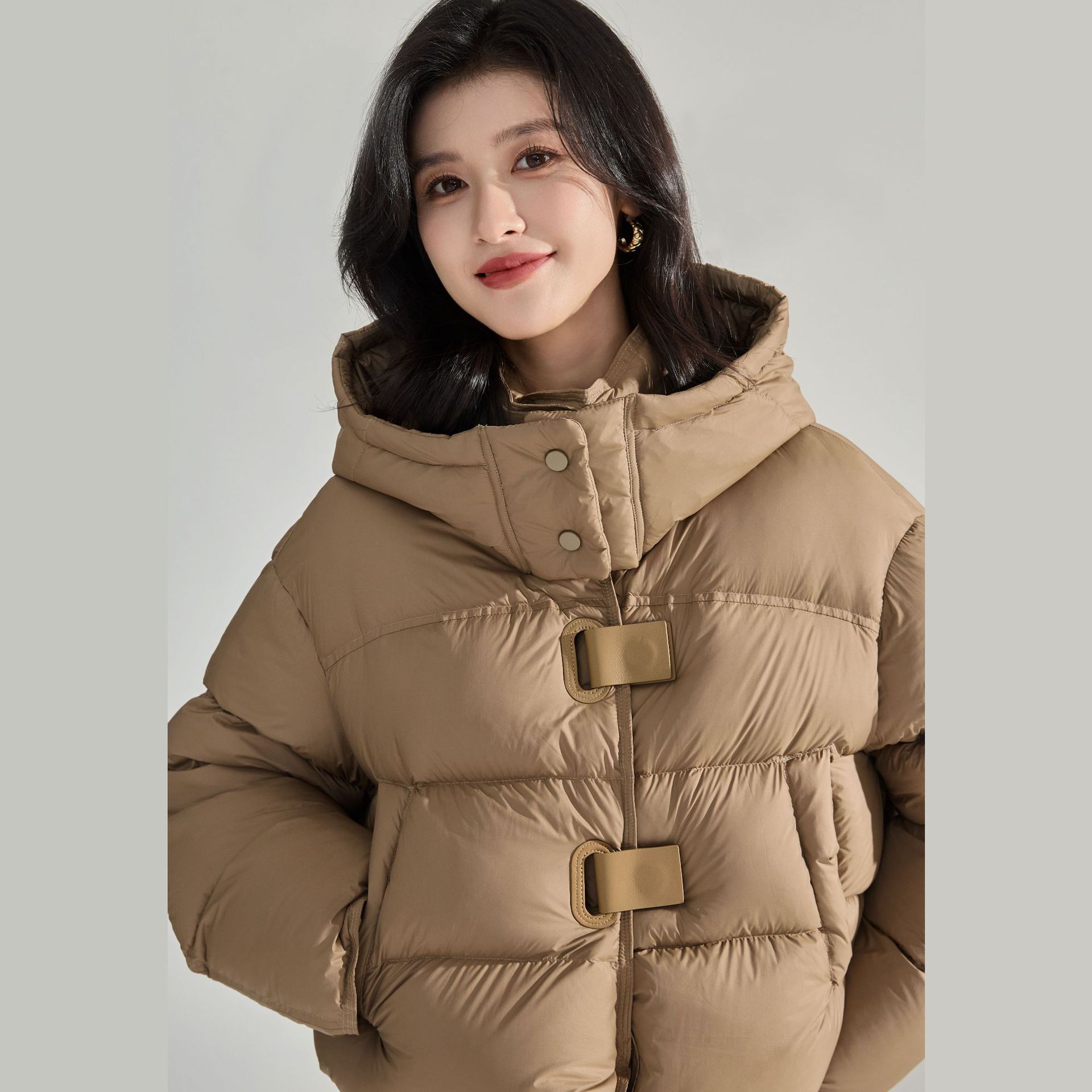冬のファッションカジュアルパフショートダウンジャケット、厚手のフード付きデザイン、レザーバックル付きパンコート15978