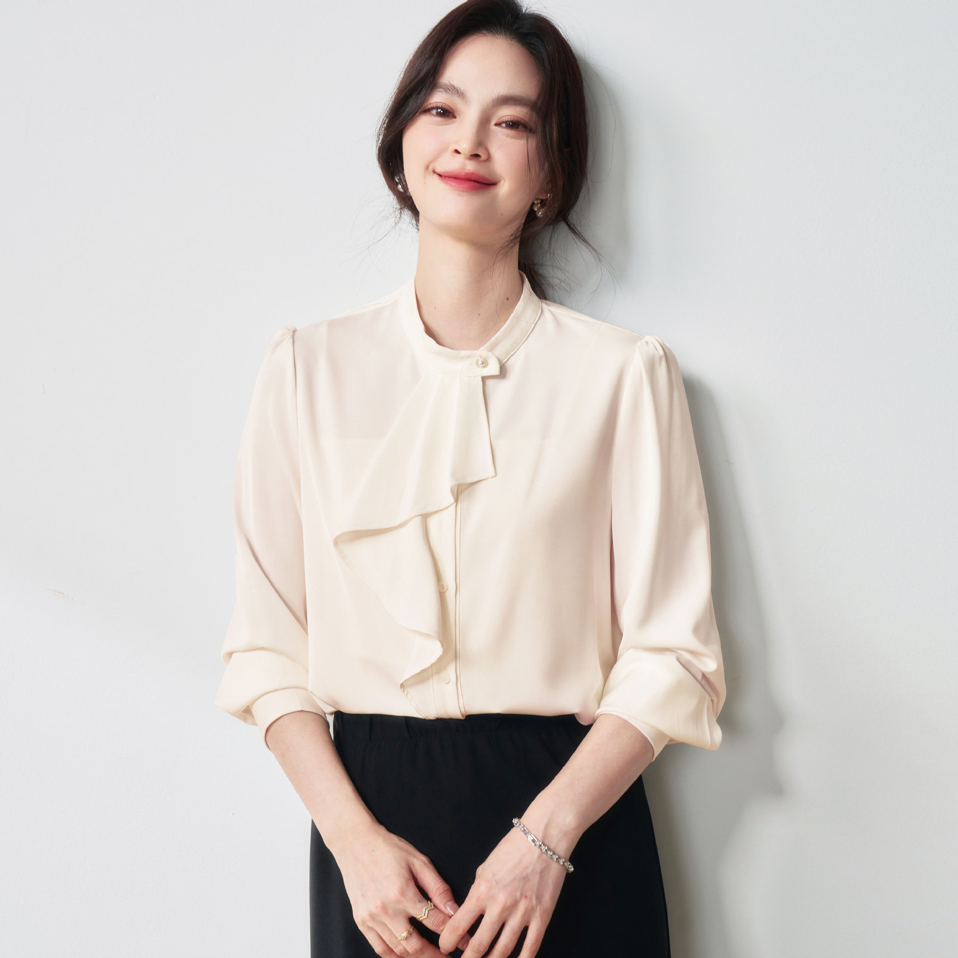 25秋ライト職場優しいスタイル不規則リボンシャツデザインOL通勤プロ長袖シャツ25058