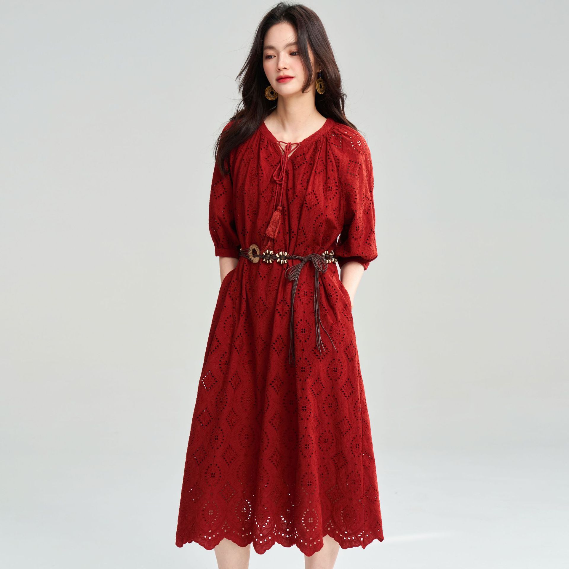25夏100精練綿万針透かし彫り錆ボヘミアンリゾート風ワンピース25052