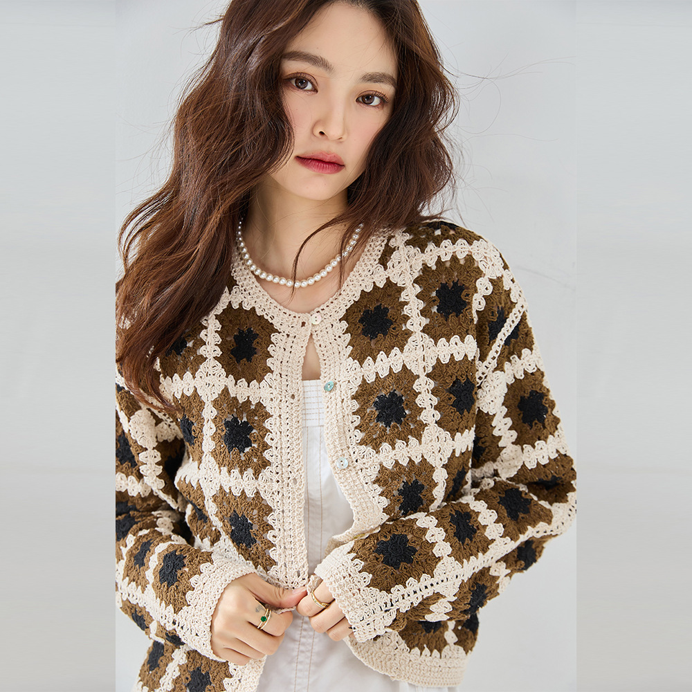 25 秋の新三次元かぎ針編みテクスチャカラーブロックシェルボタンレトロ怠惰なセータージャケットニットカーディガン女性のための 22099