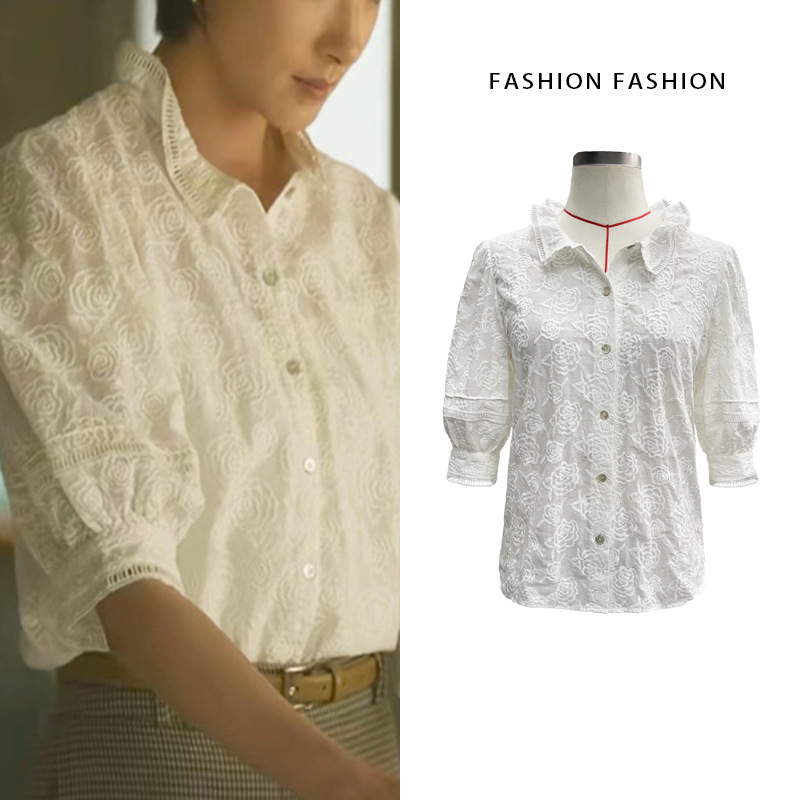 2024白色百合立体バラシャツ五分袖シャツ女潮夏