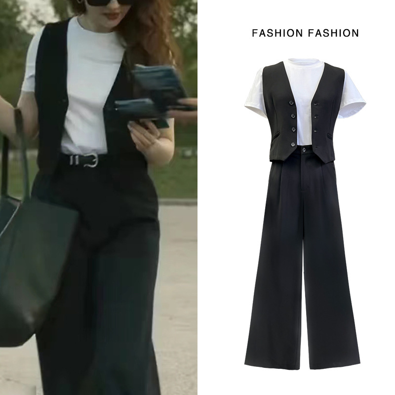新しい2024半袖tシャツと黒いベストのカジュアルなズボンのスーツの女性