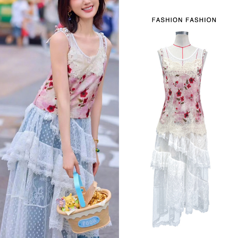 プリントストラップベストは白い糸のスカートを重ねて着ています。