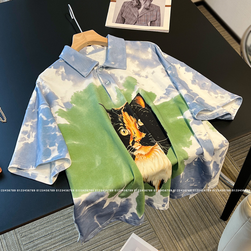2024夏の新型ゆるいカジュアルpolo襟グリーン猫アニメtシャツ女性上着気質カジュアル上着