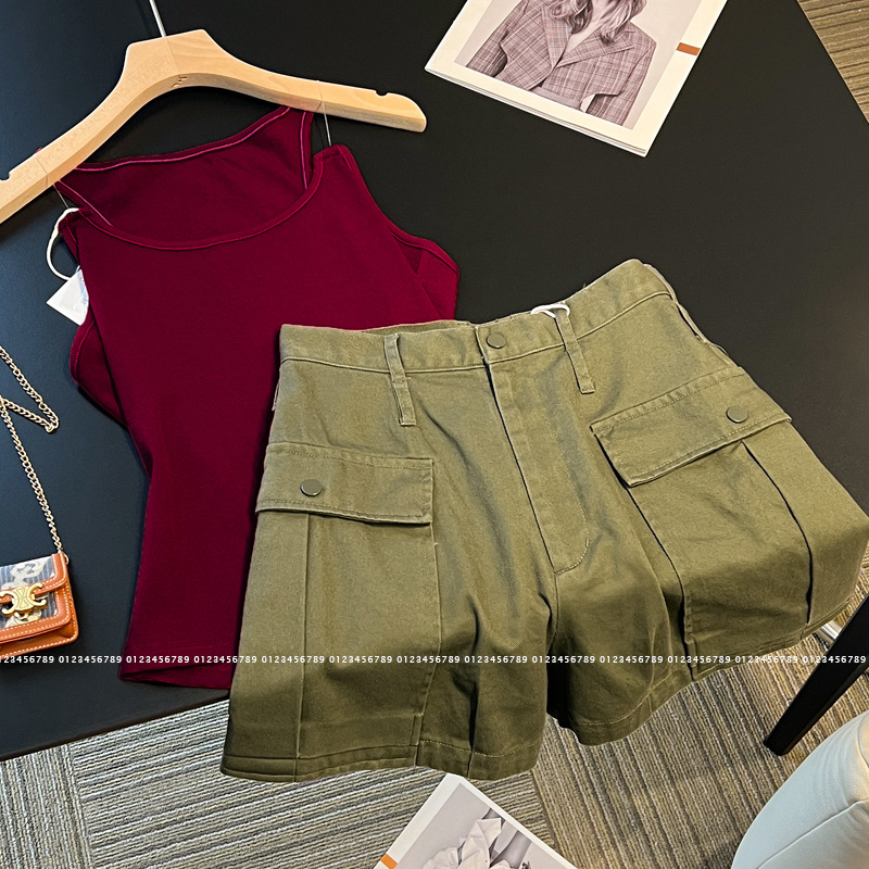 2024夏の新しいベストパンツセット女性の超クールな甘辛い魚の糸の肩にワインの赤いストラップの上着がついている