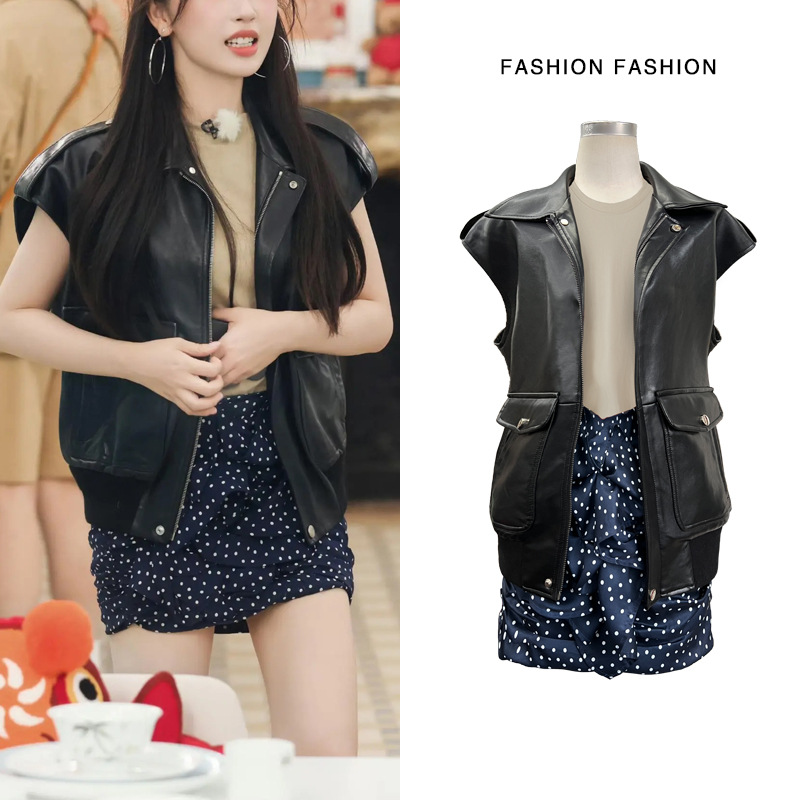 (在庫あり) 新しいラペルニッチノースリーブチョッキレザーベストファッショナブルな年齢を減らすワークジャケットとショートスカート
