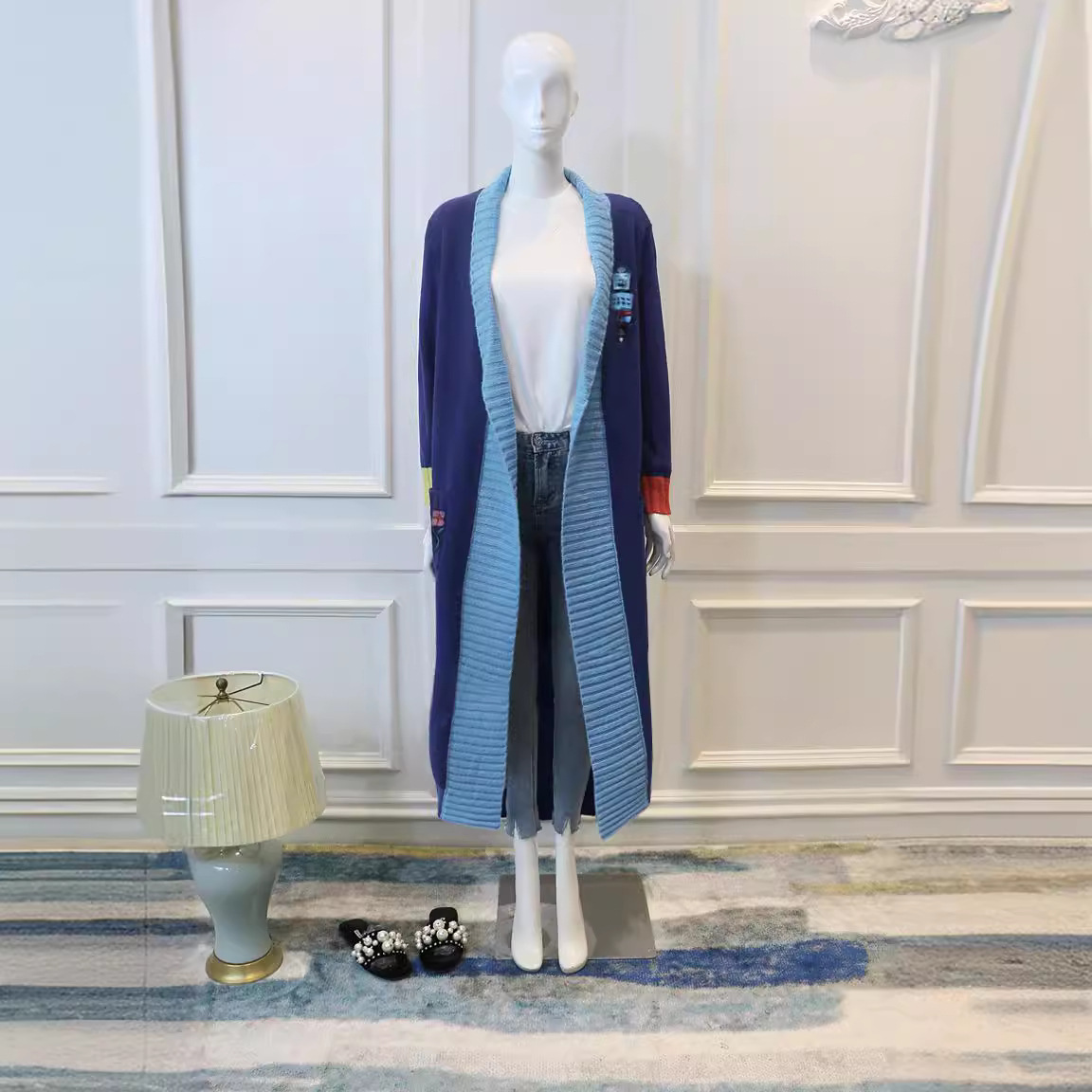 青いニットのカーディガンのコートの長い膝を越えて色の刺繍のセーターにぶつかります。