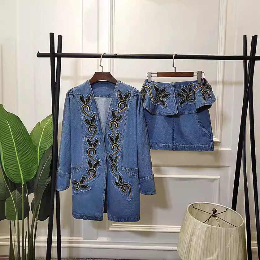 刺繍入りデニムジャケットとミディ丈フリルスカートのセットアップ レディース レトロ風 多彩な着こなしができる ゆったりとしたおしゃれなスタイル