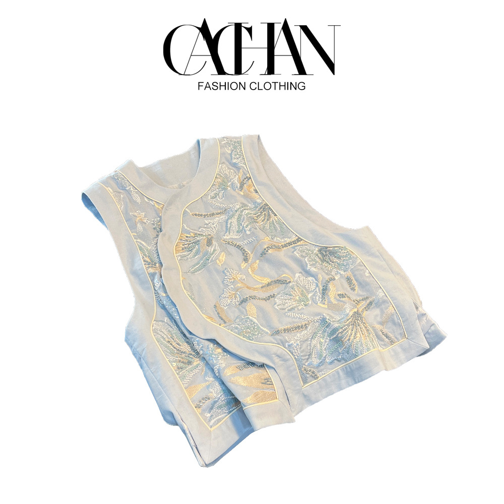 新しい中国風の高級ベスト、女性用2025年春新作、頑丈なビーズ刺繍とボタン付きジャケット、多用途トップス
