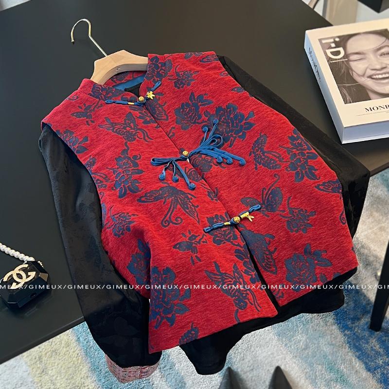 新年の赤いジャカードのレトロな馬甲の中で国の風の底のシャツの2025春の項の中国式の高級感の上着のスーツの女性に乗ります。
