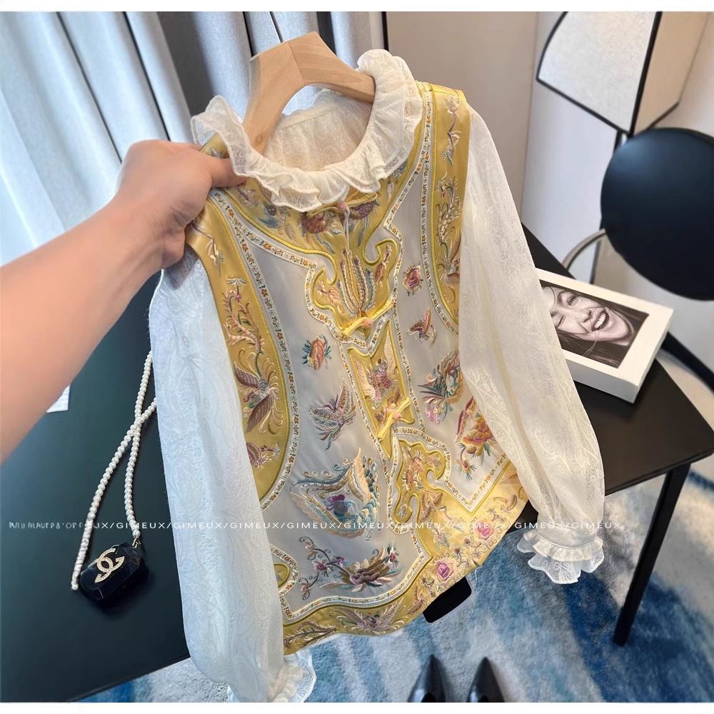 早春のフランス式の優しい風の気質の上着のスーツの2025項の新しい中国式のレースの刺繍は馬の甲のシャツの女性をつなぎ合わせます。