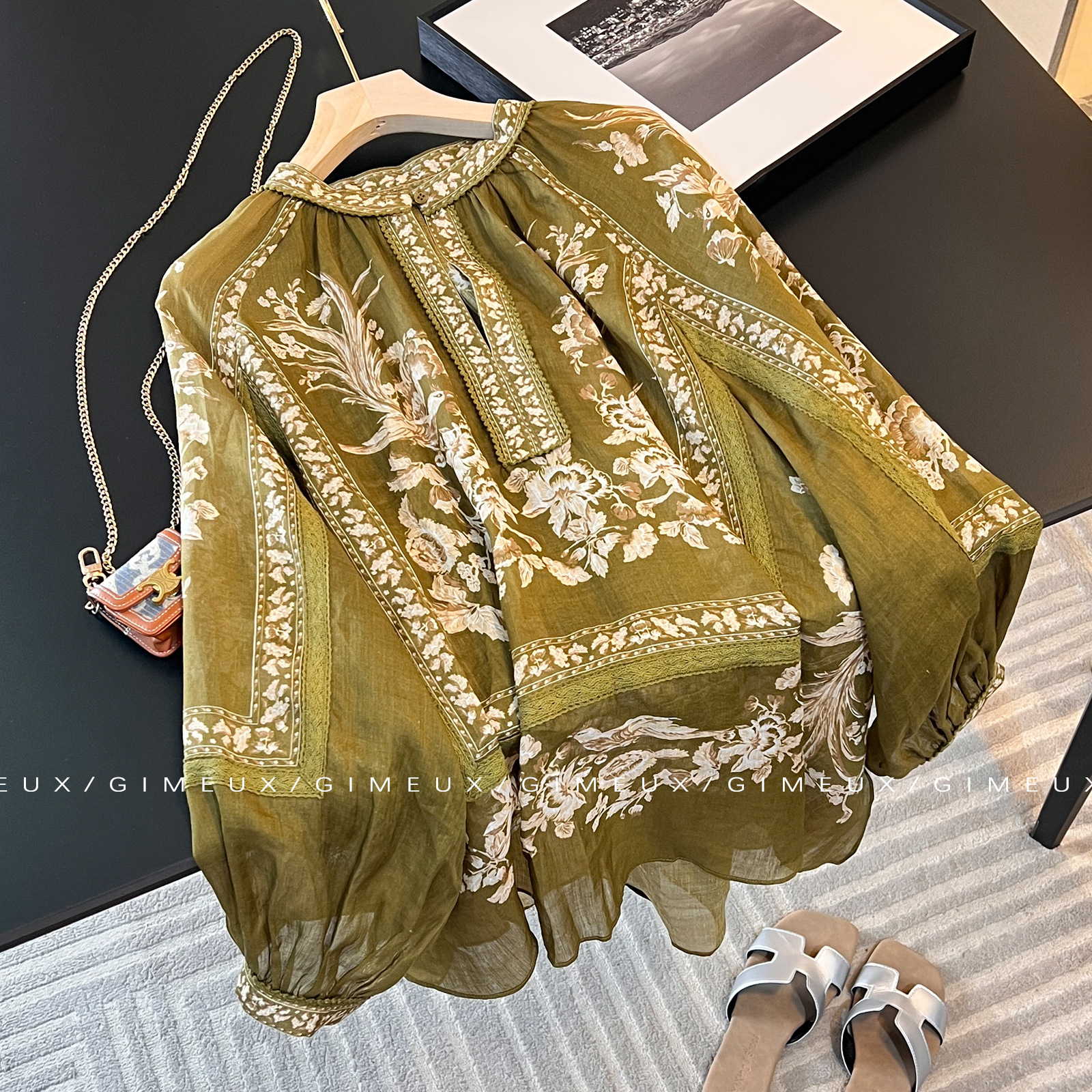 エスニックホリデースタイルプリントシャツトップ女性のための 2025 夏の新しいレトロステッチレースラウンドネック怠惰なシャツ