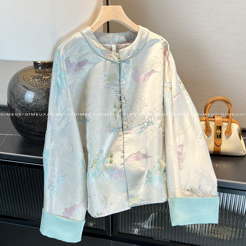 2024新中国式国風山水画箔押しジャカード立襟コート女性春新作レトロ唐服上着