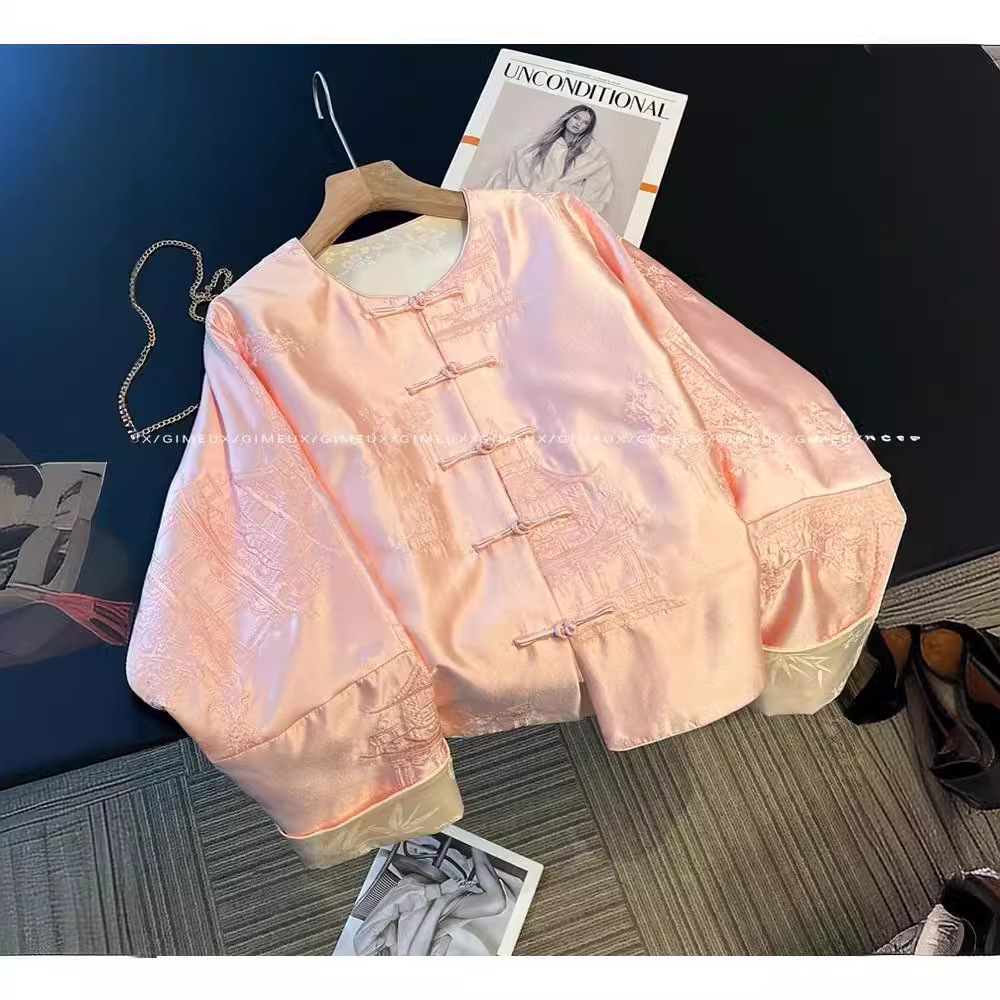 2024春のピンクの新しい中国風のプリントの皿は斜めの襟のシャツの女性の高級感の復古の古いお金の風の上着を掛けます。