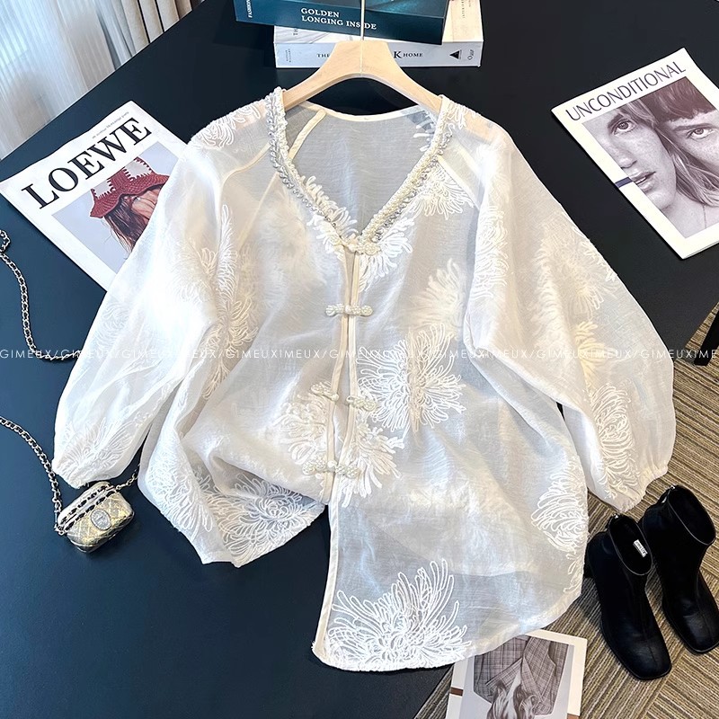 2024新中国風盤ボタン刺繍釘珠微透シャツパンツセット女性軽贅沢減齢2セット