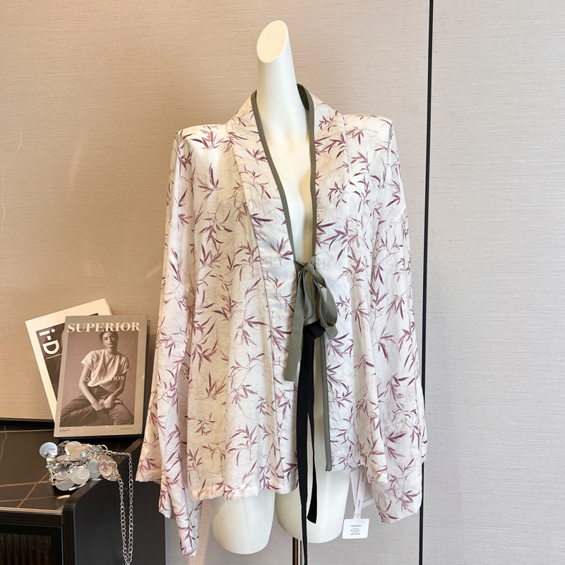 2025 夏の新中国風の竹の葉プリントシャツ長袖カーディガン女性の夏の新しいルーズトップジャケット
