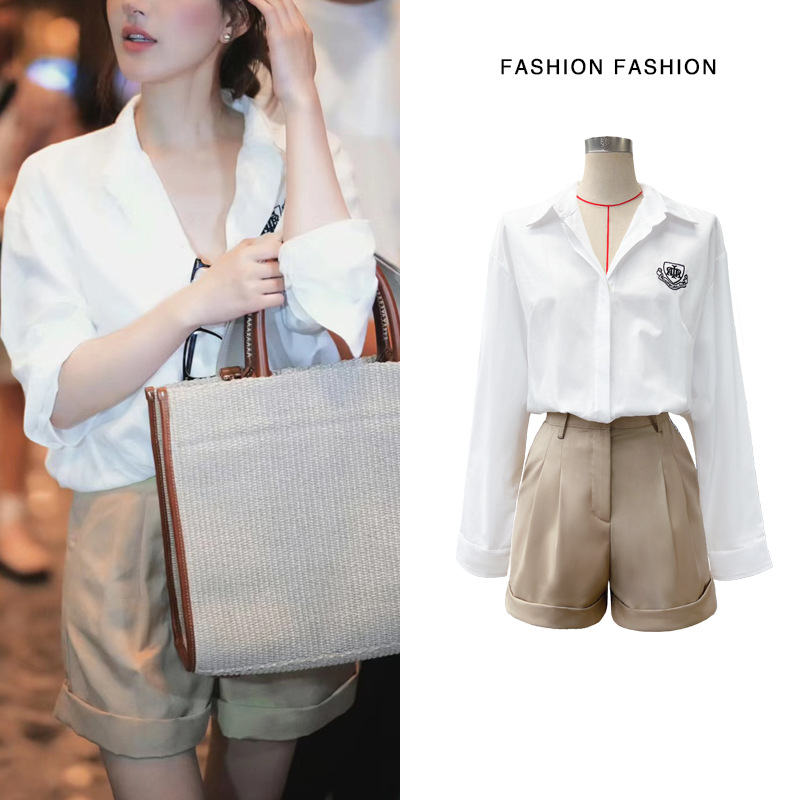 2024夏の新しい気質白いシャツvネック上着カジュアルA字ワイドパンツ女性カジュアルファッション2点セット