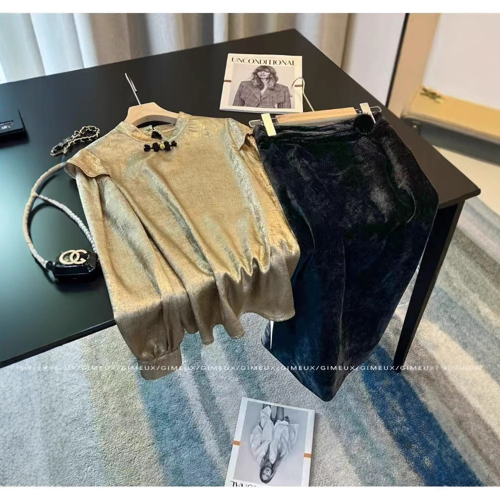 ベロアの底のシャツの女性2025春秋モデルの国風の新しい中国式は毛の辺の唐をつづり合わせて刺繍します。