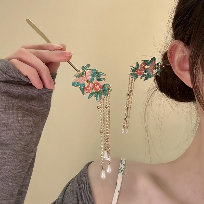 森系水墨蝶バラ風鈴流蘇髪かんざし女性新中国式丸子髪かんざし現代日常かんざし