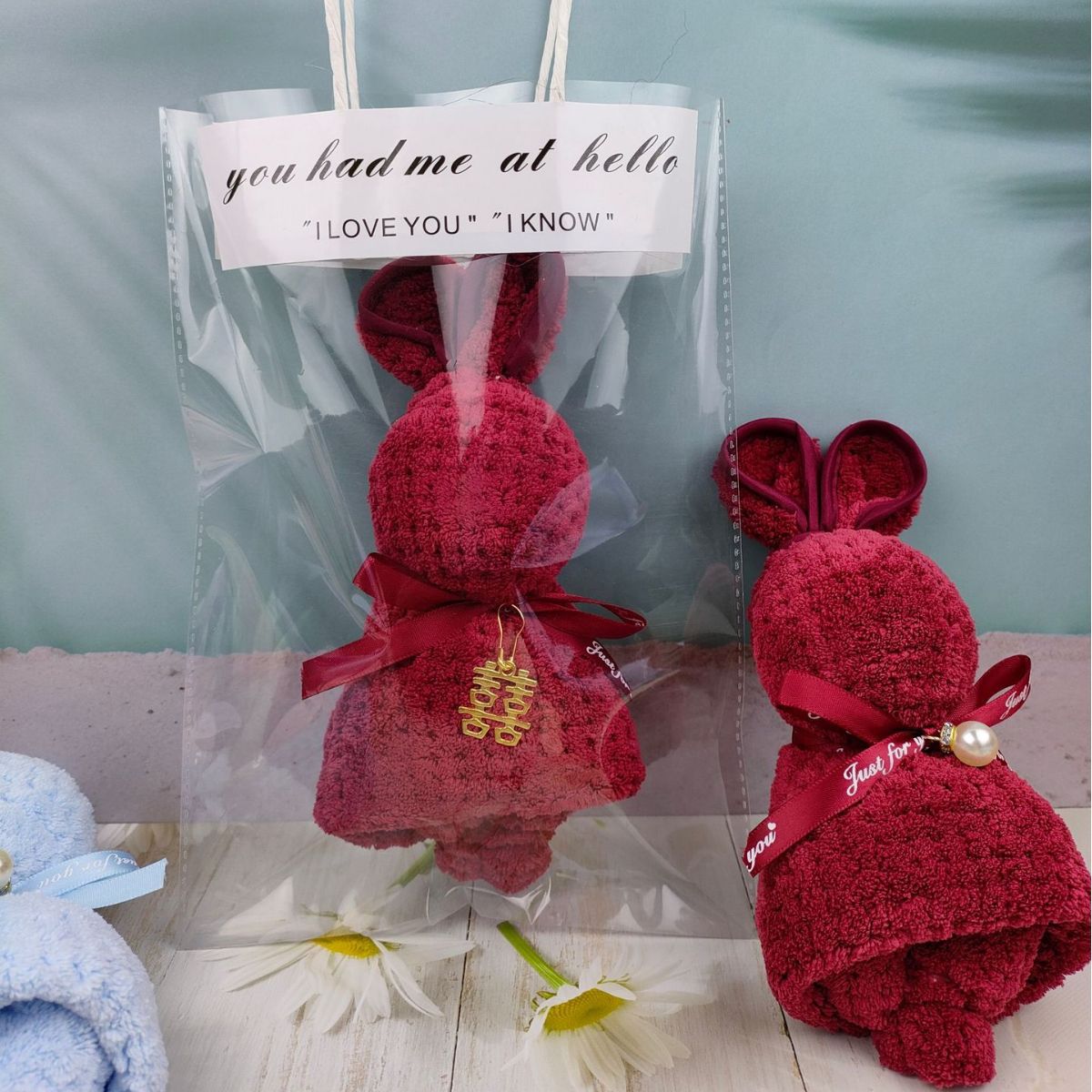 結婚式のお返しのプレゼントのサンゴのフリースの縁のタオルのウサギの形のタオルの赤い結婚祝いの喜パ