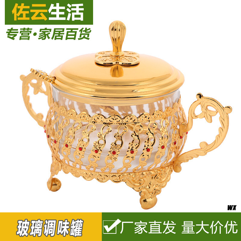国境を越えたガラス調味缶西レストラン彫刻花レトロな砂糖缶スプーン付き金色の軽贅沢中東塩缶