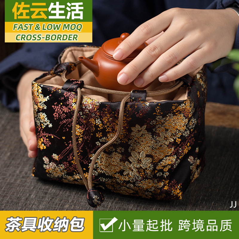 中国風レトロ雲錦一壺二杯携帯収納袋茶器茶葉缶ティーカップ旅行キャンプ収納バッグ