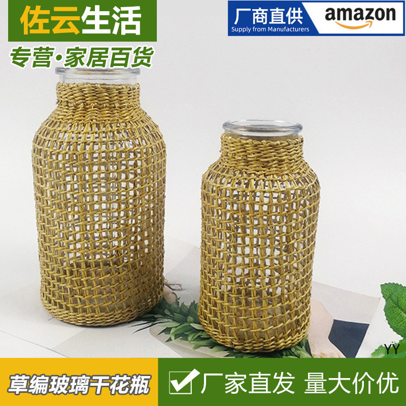 Ins風日系草編みガラス花瓶乾燥花瓶水養植物生け花家庭用装飾花瓶植木鉢置物