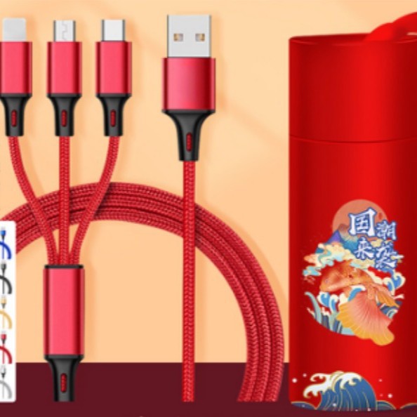 赤ナイロン編組一モップ三データ線三合一多頭2a充電線ロゴ小プレゼント製造卸売り