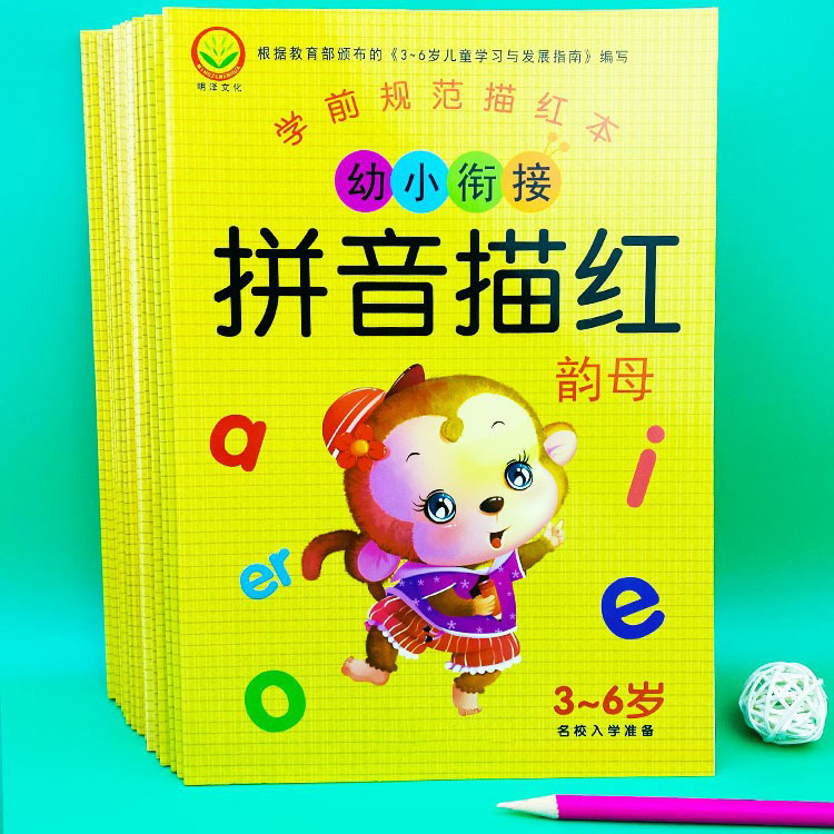 幼稚園のピンインの数字の漢字の加減算の鉛筆は赤い本の子供を描きます。