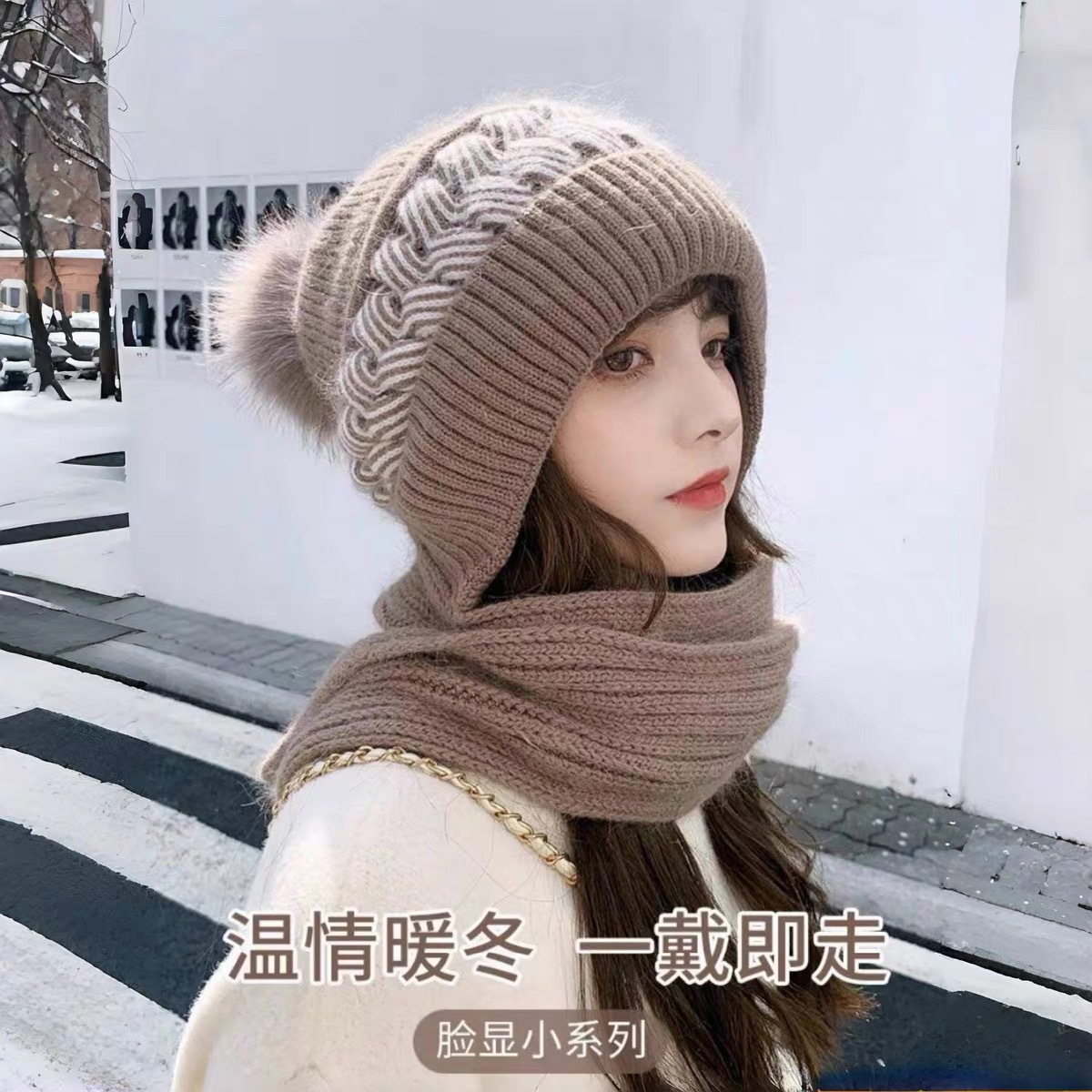 帽子とスカーフが一体になった2点セット 冬用 女性用 厚手 韓国風 保温ニット帽 耳当て付き 防風 ウール帽子 韓国風