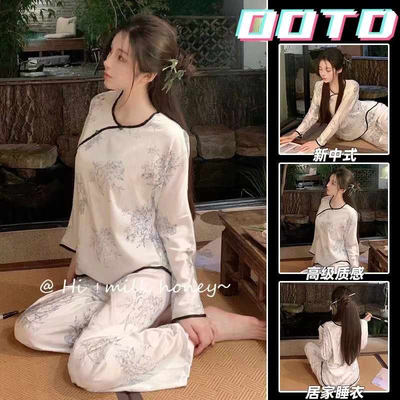 国風パジャマルームウェア2点セットレディースアイス薄手プリント爽やかで快適な長袖長ズボン2点セット