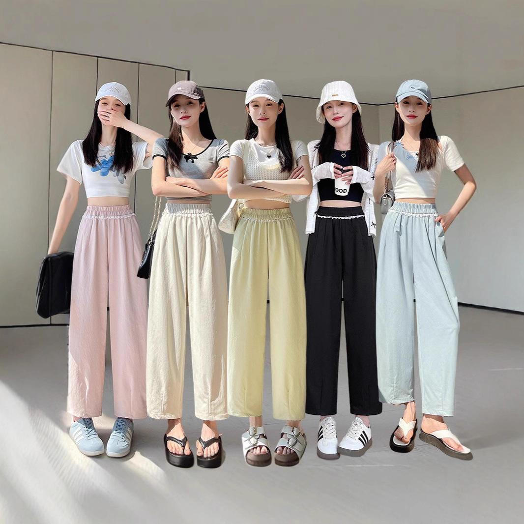 アイスシルクのシフォンのスカートの女性の夏の薄い金の2024の新型の高い腰の垂れ下がっている感じの小さい背の水墨画の国風の広い足のズボン
