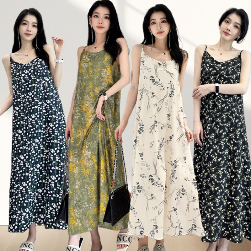 2024夏の韓国系気質の花のストラップのワンピースの女性のフランス式のゆったりしているレトロなロングスカートのハイウエストはやせているスカートを現します。
