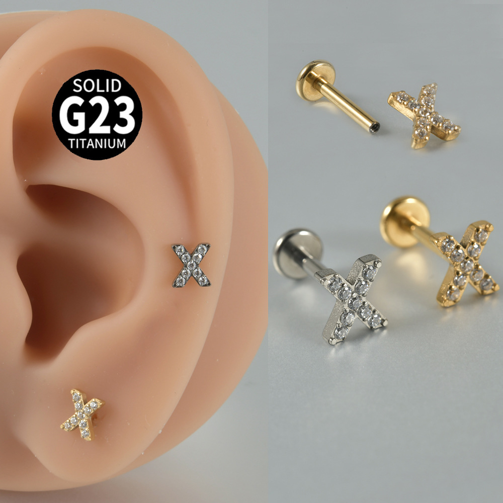 クロスボーダーg 23チタンX型めねじ唇釘文字Xジルコン耳骨釘TロッドF136チタン穿刺ピアス