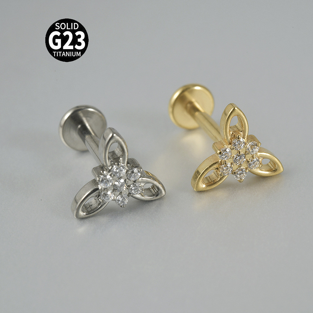 クロスボーダーG23チタンリップリングは白いジルコンの内ねじの唇の釘の三角の花のt形のまっすぐなロッドの内歯をつかんでピアスを刺します。