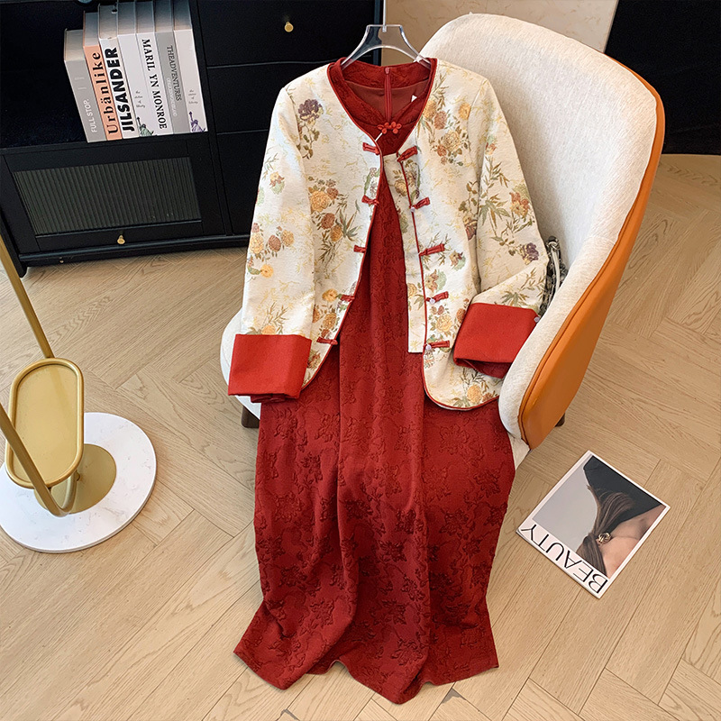 300斤の大きいサイズの婦人服の太ったmm秋冬は綿を挟んで厚いコートの新中国風のチャイナドレスのワンピースの2つのセットを挟みます。