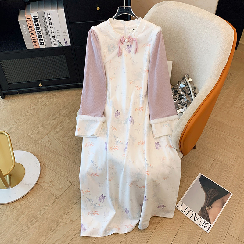 300斤の大きいサイズの婦人服の太ったmmの復古の禅意の気質はチャイナドレスの2024冬の新型の長袖のワンピースを改良します。