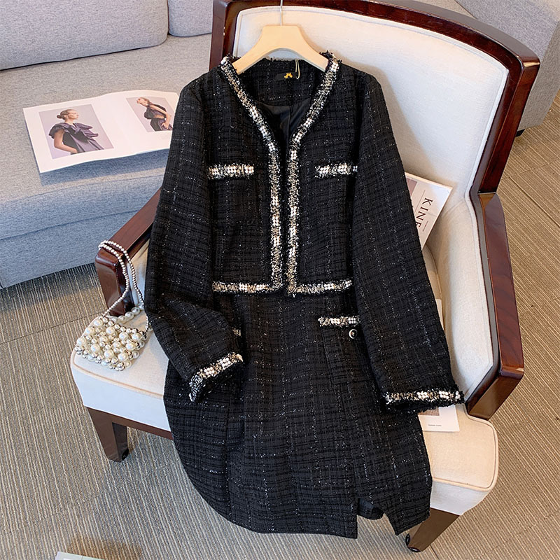 120-350斤の大きいサイズの婦人服の太った妹の小さい香風のコートのサスペンダーのワンピースの2セットの2024秋の新型