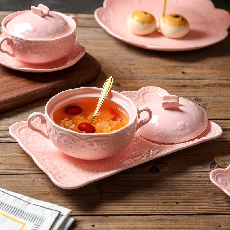 陶磁器のツバメの巣の碗のデザートの碗の双耳は蓋を持って杯の銀の耳のスープの碗の精巧なスープの杯のヨーロッパ式のおかゆの碗の食器の養生を煮込みます