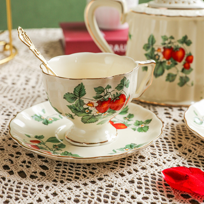 フランスのレトロなクリーム色の野のイチゴの陶磁器は金のヨーロッパ式の宮廷のコーヒーの杯の皿のイギリス式の午後のお茶の紅茶の杯を描きます。