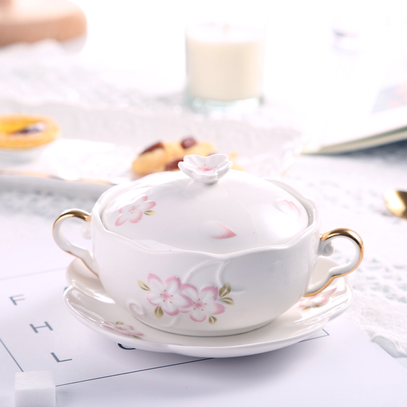 日本式家庭用隔水蓋付き浮き彫り双耳碗糖水粥碗甜品碗蒸し卵碗陶磁器燕窩煮込み杯
