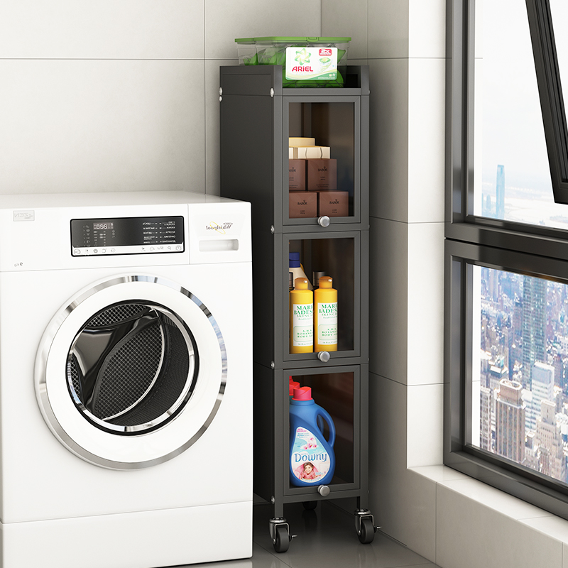 洗濯機の横に置かれた棚、床から天井までの狭い隙間、浴室のバルコニーの横に洗濯洗剤を収納するための特別なキャビネット