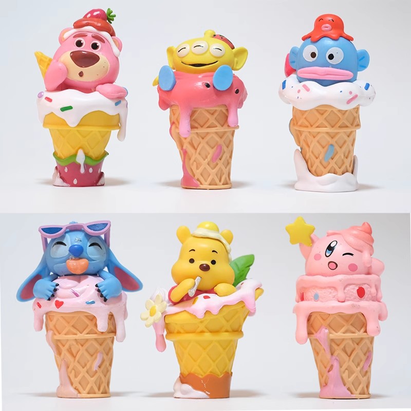 6種類のアニメスターのアイスクリームの甘い筒の形の置物のビーニーのイチゴの熊の3つの目の子のカービーのぬいぐるみは遊んでいます。